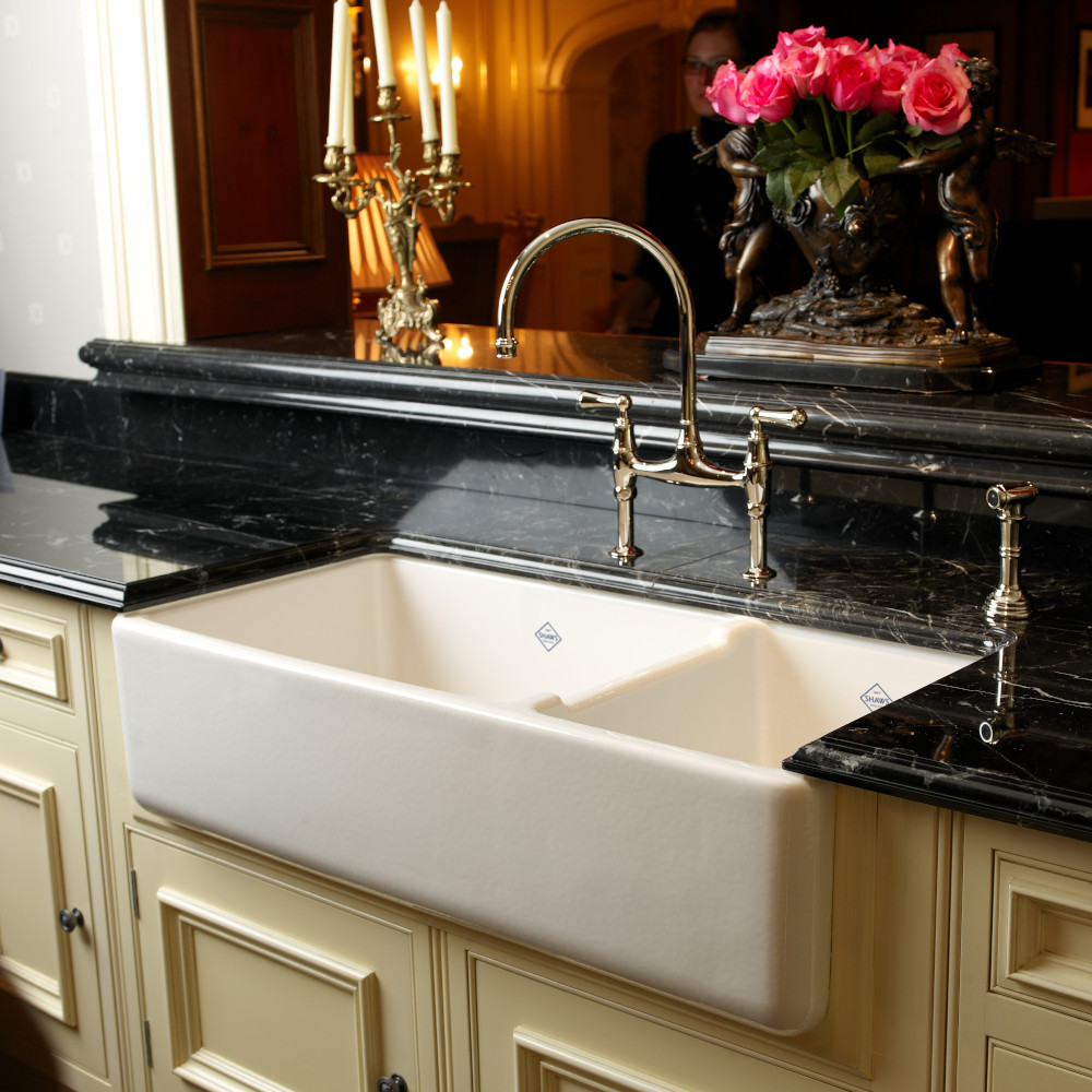 Edgworth dubbel porslinsho utan bräddavlopp tillverkad av en av de riktiga engelska kvalitetstillverkarna Shaws of Darwen. Storleken är ca 997x470x255 mm och vikten är ca 80 kg. Till denna passar Shaws extra stora bottenstrainer med porslinsinlägg.