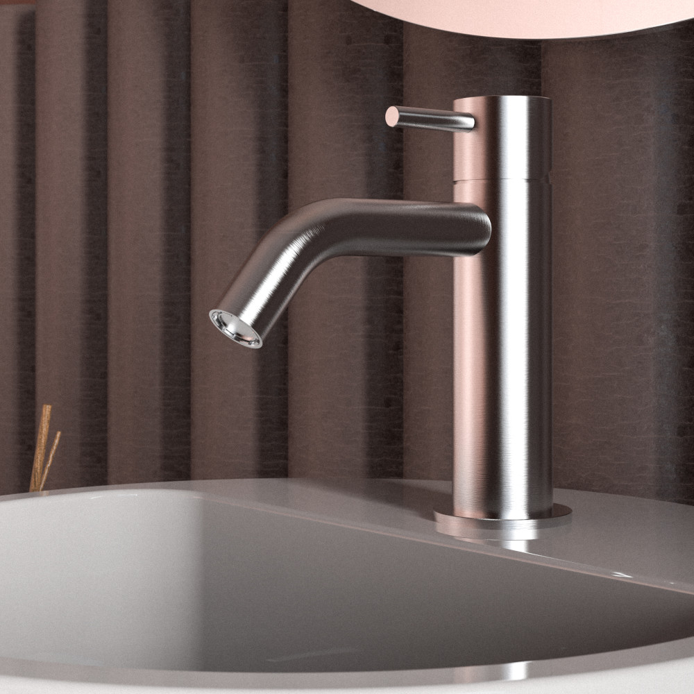 Tvättställsblandaren finns i fyra olika ytbehandlingar – borstad koppar, borstat guld, antracit och borstat rostfritt. Färgerna på bilderna är att se som riktlinjer då de kan förvanskas av skärmar, bildkomprimering och ljussättning.