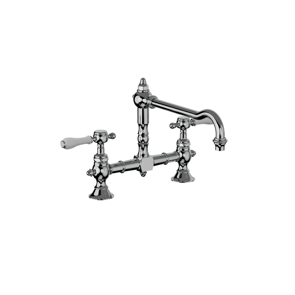 Victoria köksblandare 19.101 från franska Horus. Köksblandaren har moderna keramiska ventiler medan designen i övrigt är klassisk. De vita detaljerna på blandaren är av äkta porslin och pipen är vridbar. Avståndet mellan anslutningarna är 200 mm.